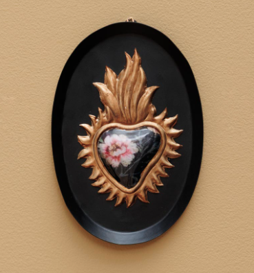 piattino ornamentale ovale in metallo nero con cuore sacro in rilievo color oro e dettaglio floreale al interno con gancio per appenderlo .