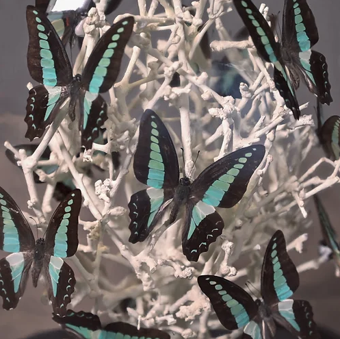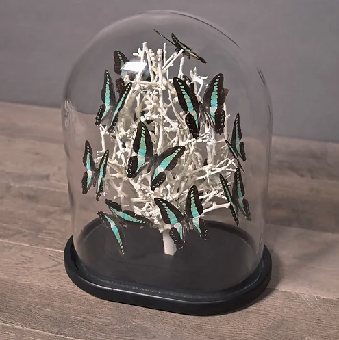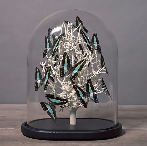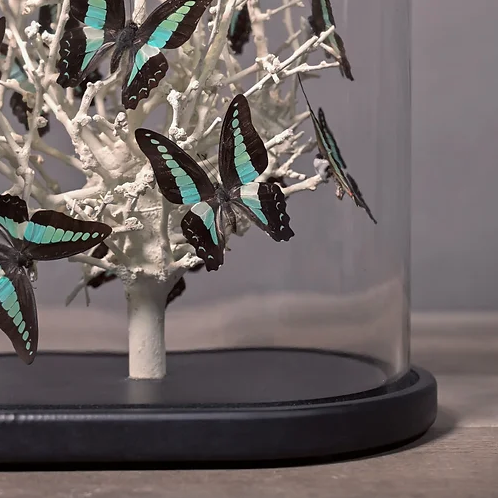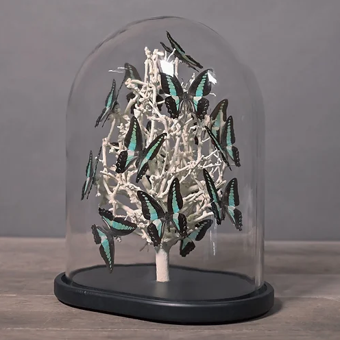 Volo di farfalle verde menta presentate su rami di Diospyros bianco, sotto una cupola di vetro “matrimoniale”, che ricorda i musei di storia naturale del XIX secolo. Ogni cupola è un pezzo unico, realizzato a mano da abili artigiani nei loro laboratori.