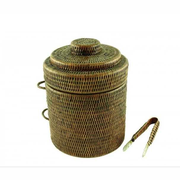 Seccchiello per il ghiaccio in midollino con contenitore isolante interno e pinza per ghiaccio.