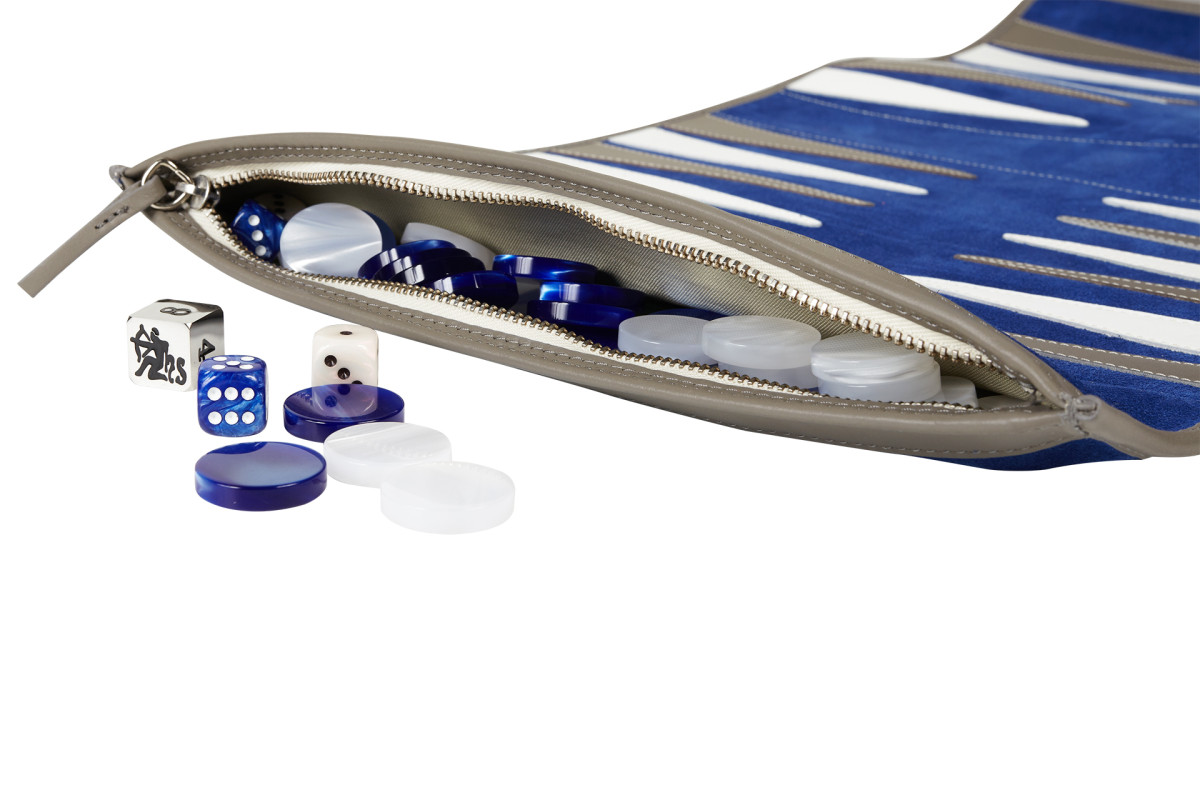Backgammon da viaggio in pelle di velluto Interni in pelle scamosciata e liscia Chiusura con cerniera Cinturino in pelle liscia rimovibile per contenere il tuo gioco arrotolato Prodotto artigianalmente in Francia nei loro laboratori di Parigi Consegnato con confezione regalo